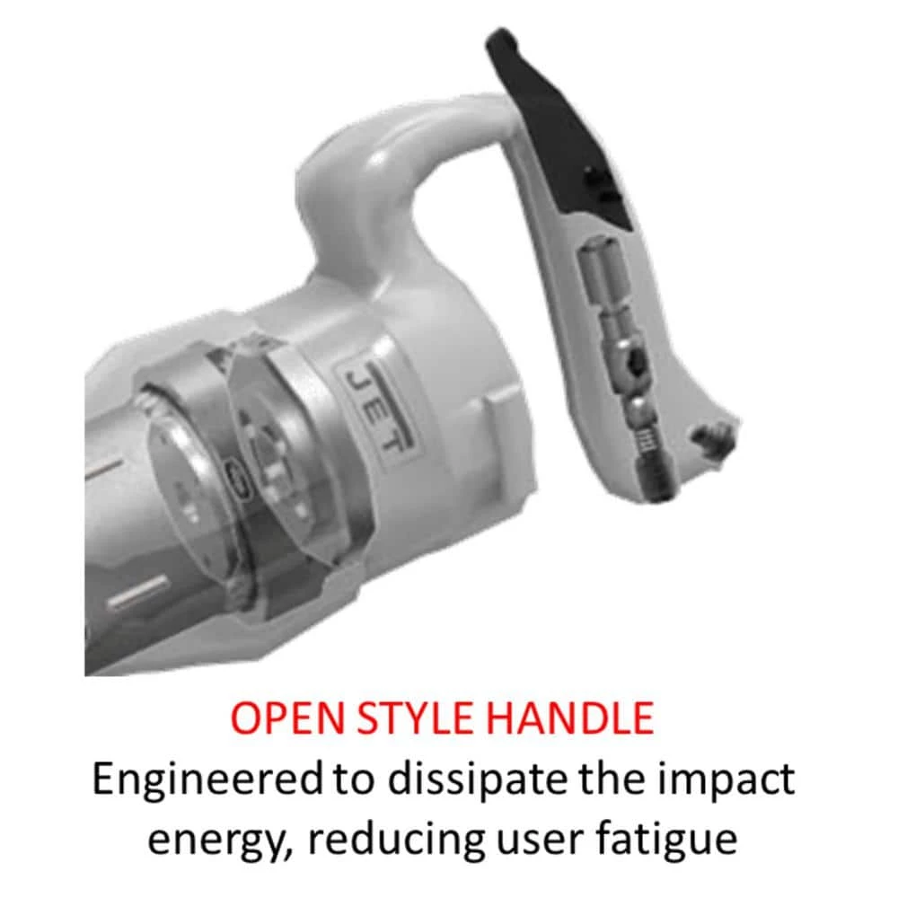 JET Chipping hammers are available in 2 heavy-duty designs with multiple capabilities. The 4 Bolt D handle model is designed for extra-strength and provides better grip. The Saw Tooth handle model is engineered to dissipate the impact energy more efficiently. Each type has the option of round or hex shaped bushing shanks. Each model can accommodate standard oval collared chisels and retainers, making these heavy-duty Chipping Hammers a staple on any construction site.