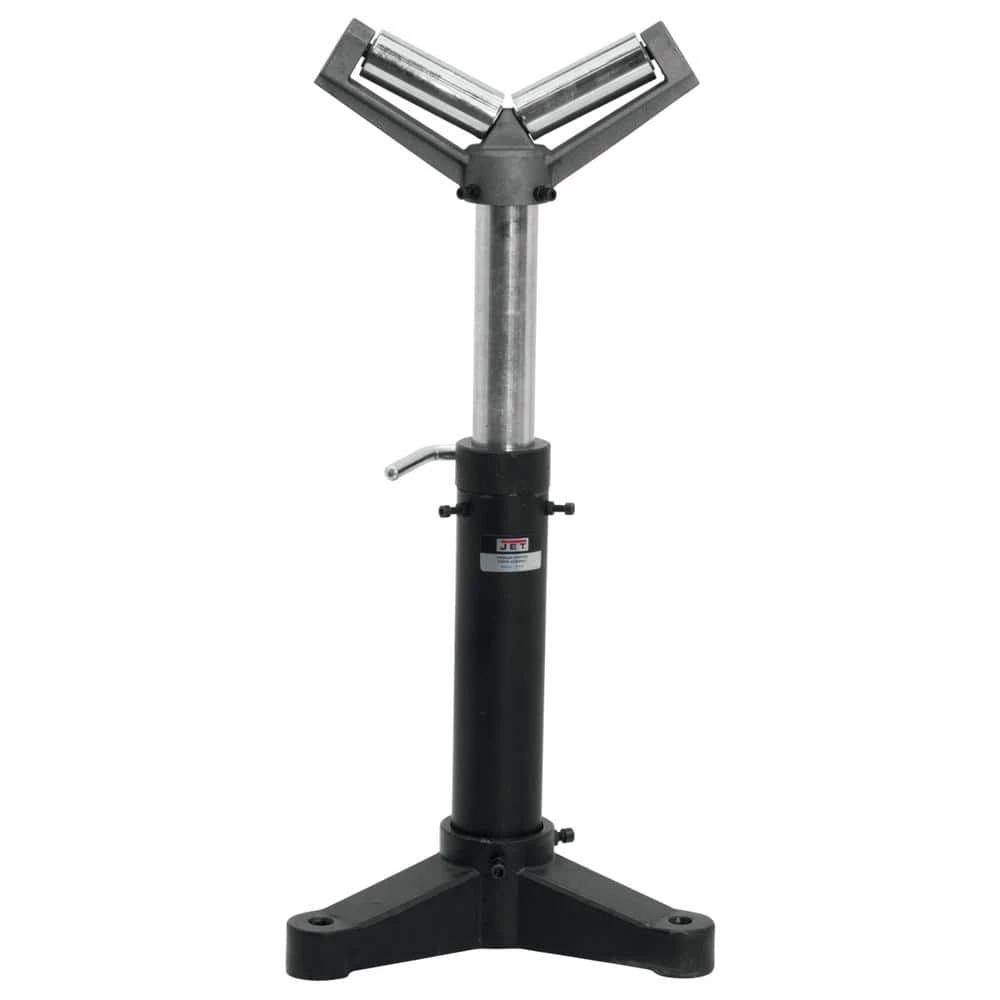 Heavy-duty V-roller material support stand. Supports up to 2,000 lbs. Adjustable from 23 in. to 38.5 in. Heavy-duty construction.