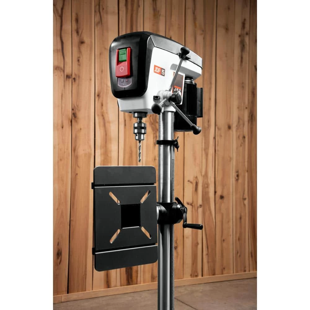The new JET JDP-15F, 15 in. is a floor standing Drill Press. From a full 3.125 in. of spindle travel to the sturdy cast iron head with a poly v-belt drive system, this drill press is designed to perform. This drill press also features a 1-handed belt-tensioning system and a large 12-1/2 in. x 17 in. work table.