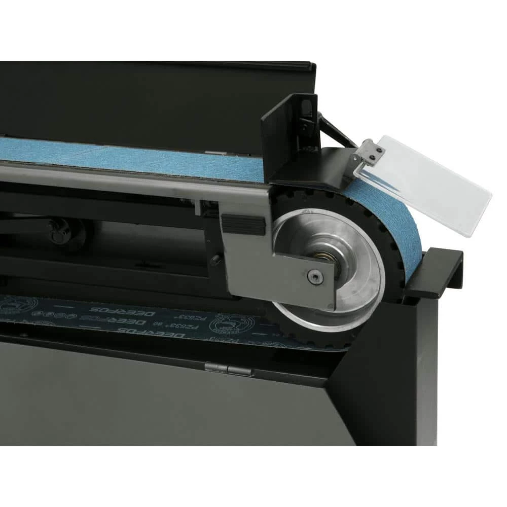 - Hinged top cover opens for access to grind large pieces using the entire length of the belt