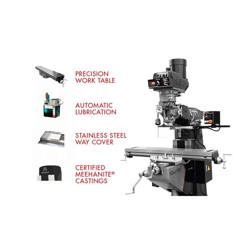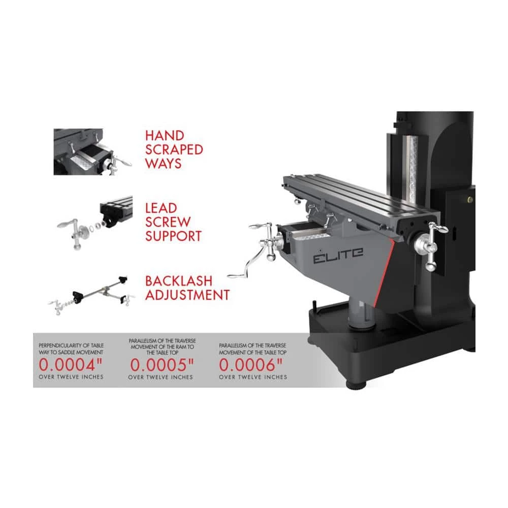 Elite offers World Class Mills fully loaded with features. When working on the design of the mills we focused our efforts on the most accurate spindle assembly to meet strict tolerance requirements. To improve the reliability and durability we went back and did things the old fashioned way, we hand scraped the ways to a minimum of 16-point per in. For operator safety all Elite Mills are CSA/CUS Certified and all come with a spindle safety guard.
