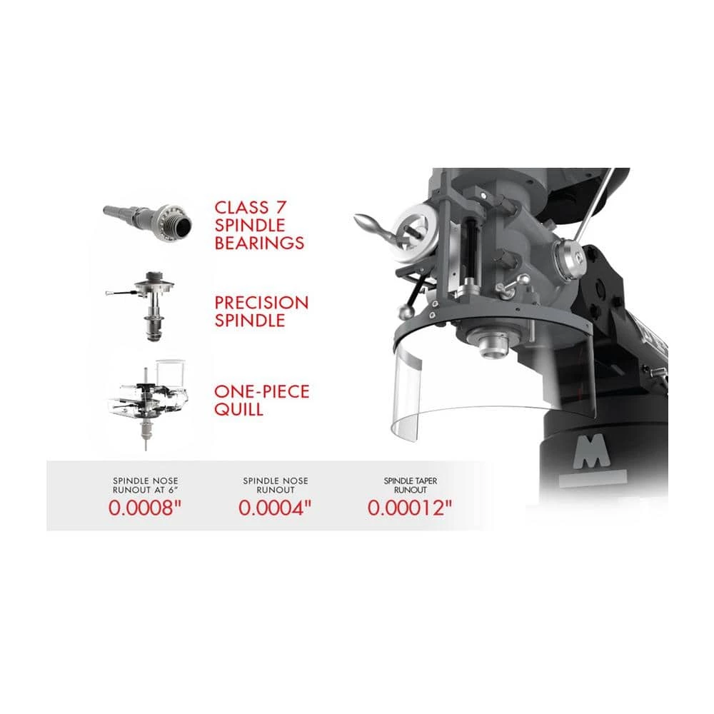 - Spindle utilizes class 7210 (P4, ABEC-7) precision angular bearings for the industry leading spindle taper runout of 0.00012 in.