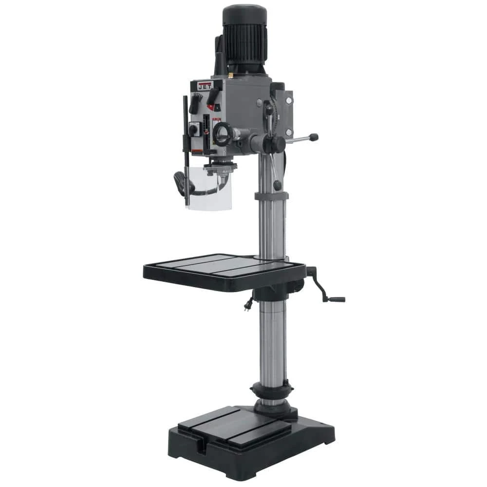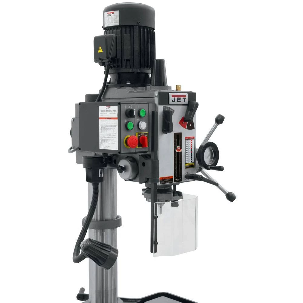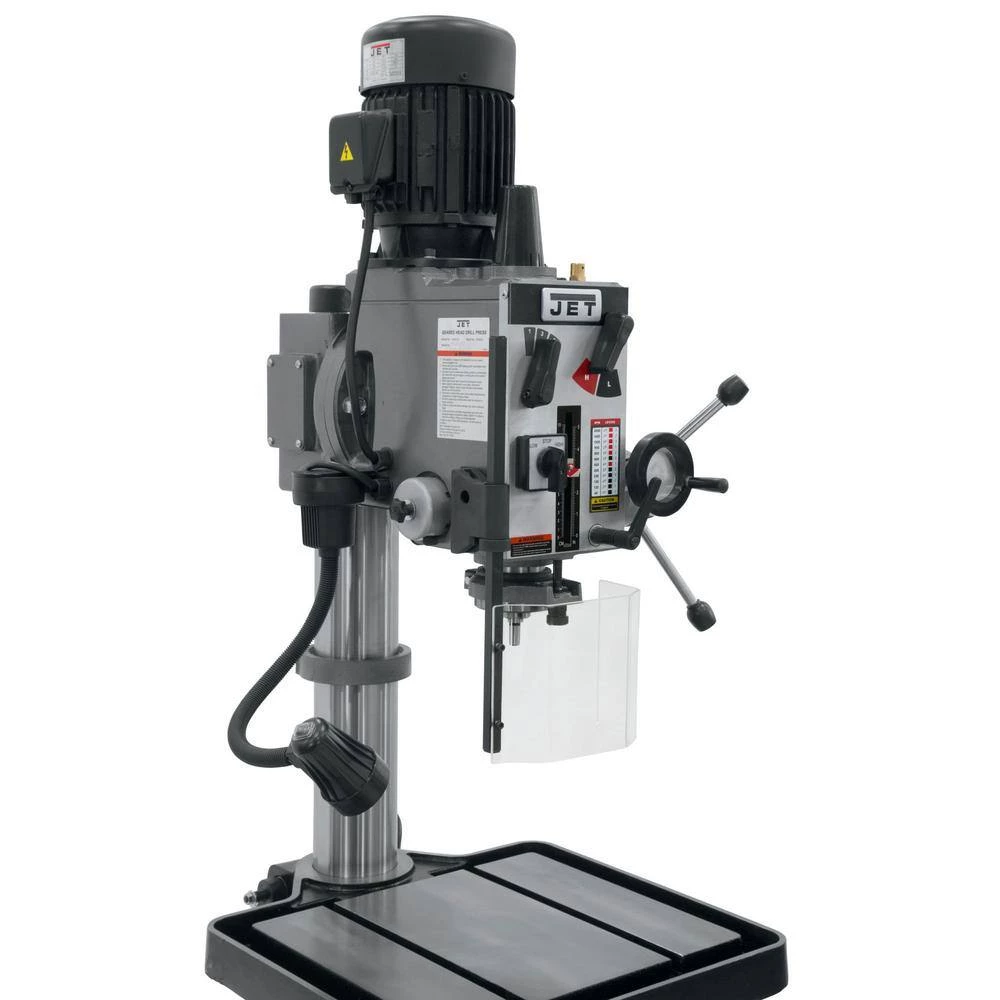 JET Geared Head Drill Presses are ideal for repetitive drilling in a wide variety of materials. These drill presses are equipped with helical gears for smooth and quiet operation, a quick-release drill ejector and English/Metric depth gauge. T-slotted table, 8 spindle speeds, and a head and table that rotate 360° around the column enhance overall use and supply premier results.