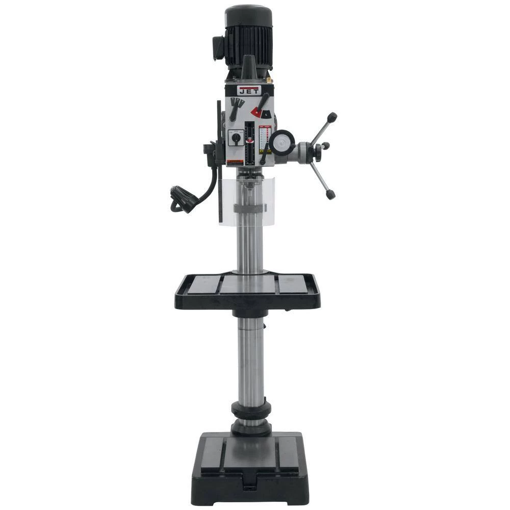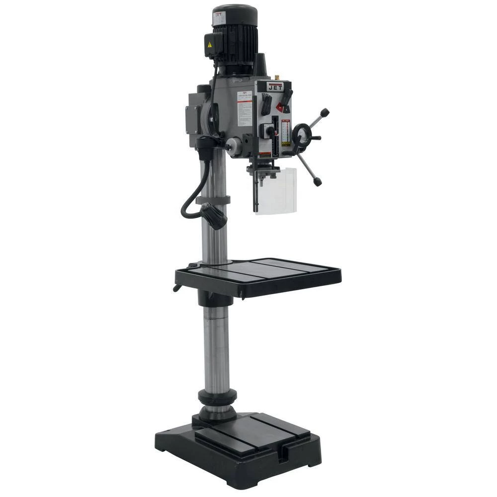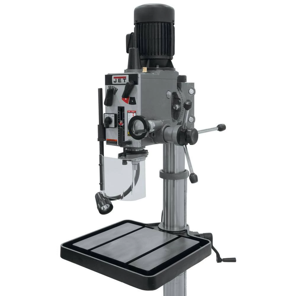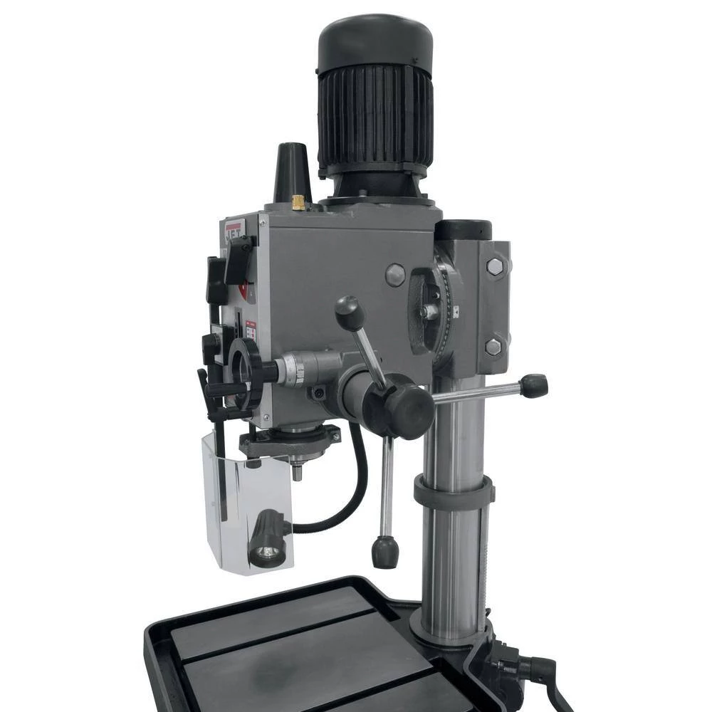 JET Geared Head Drill Presses are ideal for repetitive drilling in a wide variety of materials. These drill presses are equipped with helical gears for smooth and quiet operation, a quick-release drill ejector and English/Metric depth gauge. T-slotted table, 8 spindle speeds, and a head and table that rotate 360° around the column enhance overall use and supply premier results.