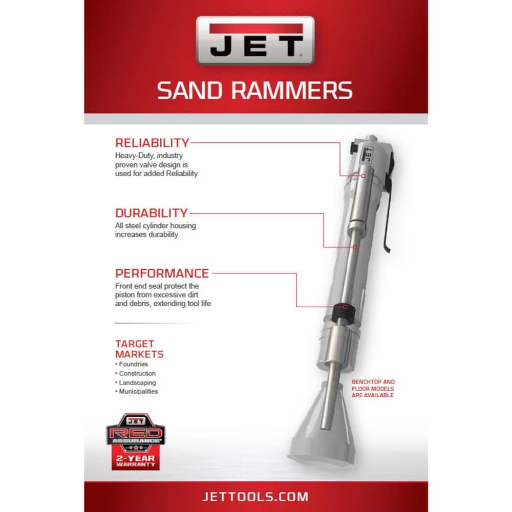 Jet Sand Rammers are available in bench and floor models. The bench models deliver fast powerful blows for ramming small medium and large forms. The floor models deliver maximum power with slow powerful blows that efficiently and quickly compact all types of backfill. Each model is ergonomically designed providing greater ease of handling with reduced operator fatigue.