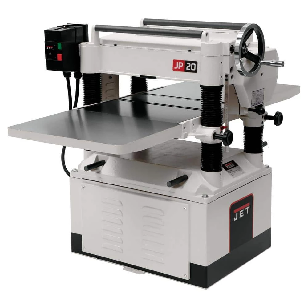 JWP-208HH-1 helical head planer quickly and quietly transforms rough lumber into smooth boards, with a full 20 planing width. Its heavy-duty cast iron and steel construction keeps the work piece steady and supported, while the conveniently located 2-speed gear box allows for quick and easy feed rate adjustments. This machine means business with a powerful 5HP induction motor combined with a helical insert cutter head housing 92 staggered carbide knives. You will appreciate the sets of 3 steel infeed and outfeed rollers to help prevent annoying snipe. A large cast-iron table with smooth-as-glass surface makes this planer a beautiful addition to the shop.