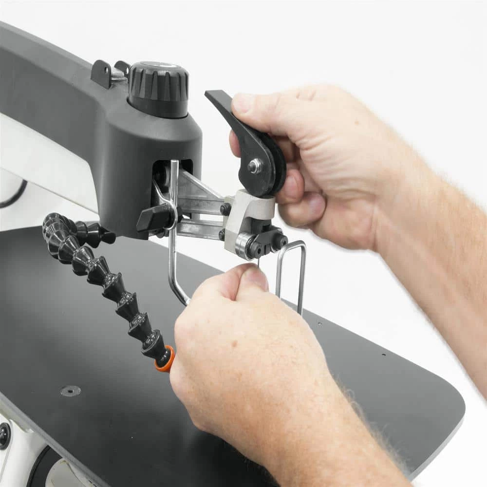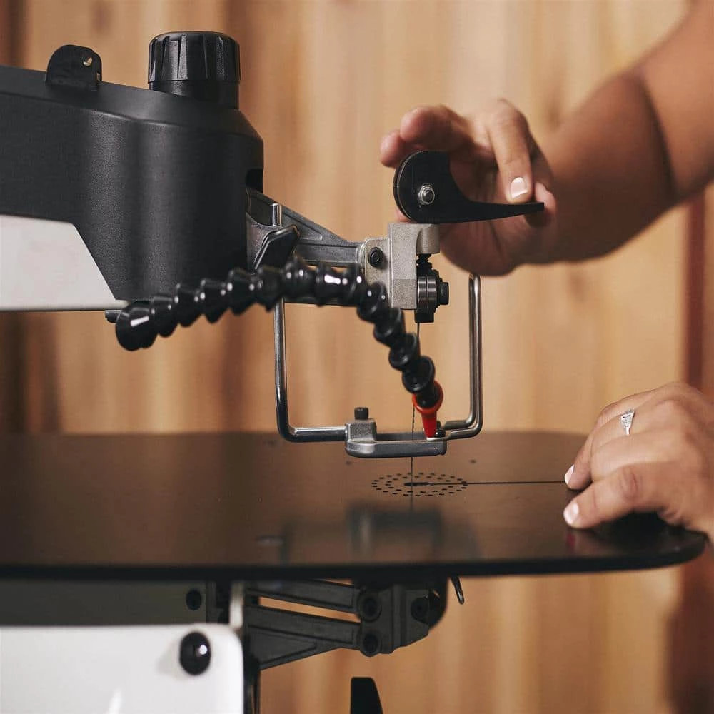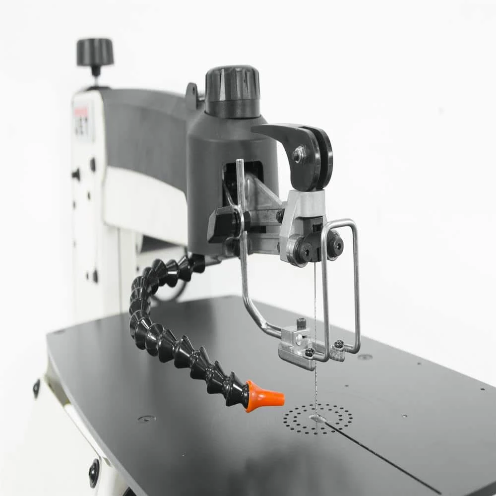 Say hello to Jet’s 18 in. scroll saw. Combining best-in-class features with innovation and thoughtful design to create the machine you’ve been waiting for. The best part about this saw is the blade change process. Our exclusive upper mechanism clamps and tensions the blade in 1 step. In addition to the upper mechanism, the toolless lower blade holder is removable and the table features a slot for the blade. The features don’t stop there: this saw offers 18 in. of throat capacity and an arm that tilts 45° right and 30° right. This saw is designed to optimize your scrolling experience. From the variable speed range to a top lift, spring loaded arm it comes fully loaded with all the features you’d expect.
