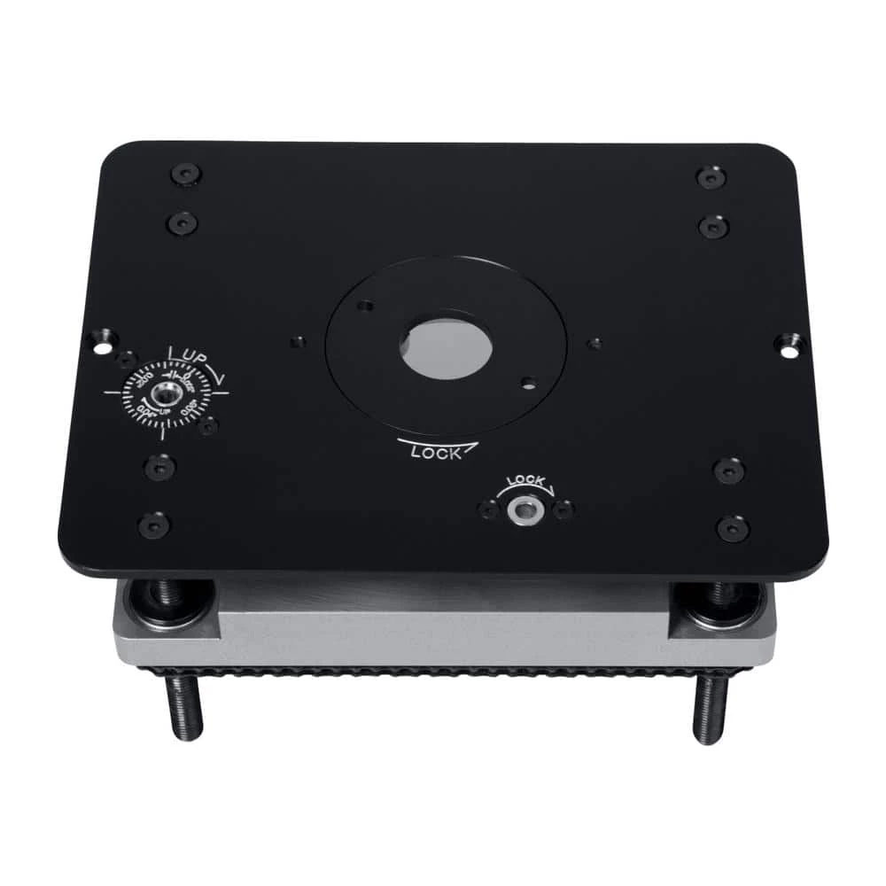 Our premium router lift kit with brake offers several features for an accurate and efficient routing experience. The sturdy 4-post, chain driven design offers smooth operation for the lifting mechanism. Above the table, 1 turn of the dials raises and lowers the lift up to 2 mm at a time. The convenient lock dial ensures the lift will stay in position no matter the load on the tool. The precision milled aluminum carriage bracket and leveling screws guarantee and accurate and easily adjustable routing experience.